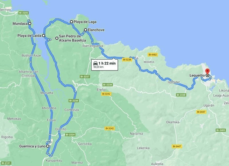 - Gernika, mirador de San Pedro de Atxarre y playas de Laida y Laga, Elantxobe, Ibarrangelu y Lekeitio.