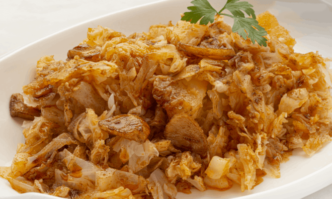 Adereza la berza con patatas con el refrito y coloca encima unas láminas de ajo. Adorna los platos con unas hojas de perejil.
