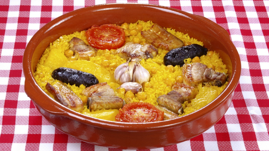 En una fuente de cristal apta para el horno o cazuela de barro añadir todos los ingredientes anteriores, más los garbanzos y el arroz.