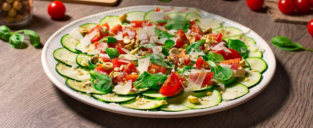 Emplatamos las rodajas de calabacín en un plato llano de forma ordenada, y repartimos los tomates y los canónigos al gusto.