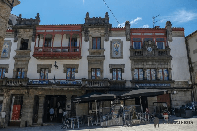 Antes de llegar a la plaza puedes pasar por delante de la bonita fachada del Pazo de Lanzós, y una vez en ella, dedicar unos minutos a las fachadas del Pazo de Bendaña, que sorprende por sus bonitos balcones enrejados y por la estatua de un Atlas sosteniendo el globo del mundo, y a la del edificio del Centro Internacional de la Estampa Contemporánea (CIEC).